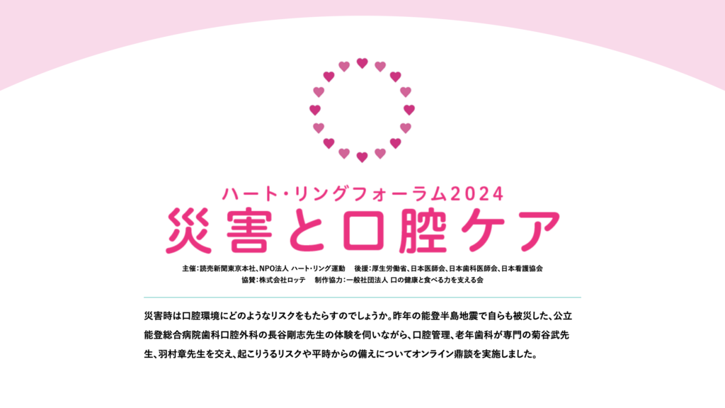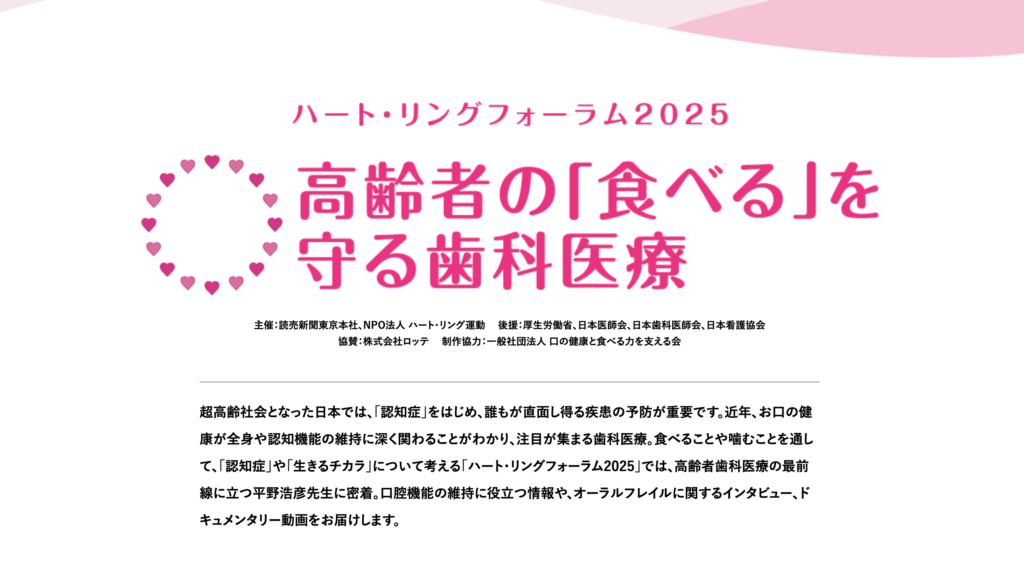 超高齢社会となった日本では、「認知症」をはじめ、誰もが直面し得る疾患の予防が重要です。近年、お口の健康が全身や認知機能の維持に深く関わることがわかり、注目が集まる歯科医療。食べることや噛むことを通して、「認知症」や「生きるチカラ」について考える「ハート・リングフォーラム2025」では、高齢者歯科医療の最前線に立つ平野浩彦先生に密着。口腔機能の維持に役立つ情報や、オーラルフレイルに関するインタビュー、ドキュメンタリー動画をお届けします。